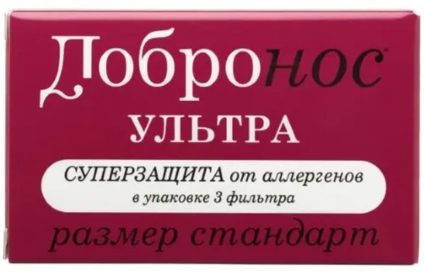 ДОБРОНОС УЛЬТРА ФИЛЬТР ДЛЯ НОСА МИНИ - предназначен для профилактики аллергического ринита путем фильтрации микрочастиц, таких как пыльца, пыль и бактерии из воздуха, вдыхаемого пациентом через ноо (например, страдающего аллергией или на вредном производства).УСЛОВИЯ ПРИМЕНЕНИЯ/ПОЛЬЗОВАТЕЛИФильтр можно использовать в условиях специализированных медицинских учреждений, дома, на улица.Для использования фильтра не требуются специальные знания.Достаточно соблюдать инструкцию по применению.ФИЛЬТРЫ ДЛЯ НОСА ДОБРОНОС УЛЬТРА- МИНИ фильтруют частицы размером менее 0,1 мкм, что достигается усиленной влажной фильтрацией и двойным фильтрующим элементом. Рекомендуются если симптомы аллергии в носу не уходят при использовании фильтров Комфорт и Плюс. Используются во влажном виде. Дыхание более затруднено, чем с фильтрами Плюс из-за того, что эффективность фильтрации САМАЯ ВЫСОКАЯ (два типа фильтрующих элементов в каждом фильтре).ОПИСАНИЕ МЕДИЦИНСКОГО ИЗДЕЛИЯ (РУ № РЗН 2019/9138 от 31.10.2019)Фильтр для индивидуального многоразового использования, предназначенный для фильтрации вдыхаемого воздуха. Фильтр, вставляется в носовые пути и закрепляется перемычкой, которая располагается под перегородкой носа. При вдохе воздух, проходящий через фильтрующий элемент, практически в полном объеме очищается от аллергенов, пыли и прочих патологических объектов.ФИЛЬТР УЛЬТРА- МИНИ очищает вдыхаемый через нос воздух от:- аллергенов (пыльца, споры грибов, перхоть животных, пыль)- бытовой, уличной и дорожной пыли- смога и гариСовместимостьФильтр не предназначен для использования в сочетании с какими-либо изделиями. Каждый фильтр помещается в отдельную упаковку по 3 шт. и предназначен для многоразового использования. Изделие поставляется в нестерильном виде.Пропускная способность - не менее 28,3 л/минЭффективность фильтрации - 99,8%Диаметр фильтра 10,7 ммРасстояние между центрами фильтров 16,5 ммРасстояние от середины перемычки до верхушки фильтра 16,8 мм