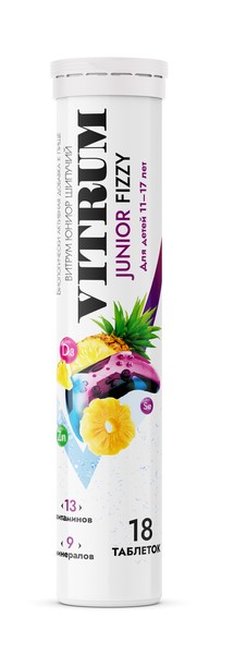 ВИТРУМ ЮНИОР ШИПУЧИЙ (VITRUM JUNIOR FIZZY) - Биологически активная добавка (БАД) к пищеВозраст: детям от 11 до 17 летОдна таблетка содержит: % от нормы физиологических потребностейМальчики 11-14 лет Девочки 11-14 лет Юноши 15-17 лет Девушки 15-17 летОДНА ТАБЛЕТКА СОДЕРЖИТ: % от нормы физиологических потребностейМальчики 11-14 лет Девочки 11-14 лет Юноши 15-17 лет Девушки1 5-17 летВитамин С 65,0 мг 93 108* 72 93Витамин РР 13,0 мг 72 72 65 72Витамин Е 9,0 мг 75 75 60 60Пантотеновая кислота 4,5 мг 129* 129* 90 113*Витамин В6 1,14 мг 67 71 57 71Витамин В1 0,9 мг 69 69 60 69Витамин В2 0,85 мг 57 57 47 57Витамин А 800,0 мкг 80 100 80 100Фолиевая кислота 100,0 мкг 33 33 25 25Витамин К 30,0 мкг 38 43 25 30Биотин 30,0 мкг 120* 120* 60 60Витамин D3 5,0 мкг 33 33 33 33Витамин В12 1,8 мкг 60 60 60 60Кальций 20,0 мг 2 2 2 2Фосфор 15,5 мг 2 2 2 2Железо 4,0 мг 33 27 27 22Магний 3,2 мг 1 1 1 1Цинк 1,2 мг 10 10 10 10Марганец 1,0 мг 50 50 33 33Медь 0,4 мг 50 50 40 40Йод 100,0 мкг 77 77 67 67Селен 10,0 мкг 25 25 20 20*не превышает верхний допустимый уровень физиологических потребностейЭнергетическая ценность 1 таблетки 50 кДж / 12 ккал.ВИТРУМ ЮНИОР ШИПУЧИЙ - ФОРМУЛА АЛЯ ЗДОРОВЬЯ И РАЗВИТИЯ ПОДРОСТКОВ В ШИПУЧЕЙ ФОРМЕ13 витаминов9 минераловСОДЕРЖИТ ВИТАМИНЫ ГРУППЫ В, ЙОД, МАРГАНЕЦ, Е, С, ЦИНК:-Поможет скорректировать нервную возбудимость-Улучшит память и внимание-Входят в схемы лечения и профилактики угревой сыпиПРЕИМУЩЕСТВА ШИПУЧЕИ ФОРМЫ VITRUM-Высокая абсорбция действующего вещества-Отсутствие травмирующего воздействия на слизистую оболочку-Простота использования и приятный вкус-Незаменимы при затруднении глотания (в частности у детей)