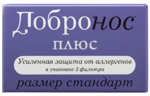 ФИЛЬТРЫ ДЛЯ НОСА ДОБРОНОС ПЛЮС фильтруют частицы размером от 0,5 мкм (и более), что достигается усиленной влажной фильтрацией. Это позволяет им, помимо пыли и пыльцы растений, очищать вдыхаемый воздух от таких аллергенов как перхоть домашних животных, споры грибов и домашняя пыль. Рекомендуются если симптомы аллергии в носу не уходят при использовании фильтров Комфорт. Используются во влажном виде. Дыхание немного тяжелее из-за того, что эффективность фильтрации высокая.ОПИСАНИЕ МЕДИЦИНСКОГО ИЗДЕЛИЯ (РУ № РЗН 2019/9138 от 31.10.2019)Фильтр, вставляется в носовые пути и закрепляется перемычкой, которая располагается под перегородкой носа. При вдохе воздух, проходящий через фильтрующий элемент, практически в полном объеме очищается от аллергенов, пыли и прочих патологических объектов. Фильтр выпускается в двух размерах СТАНДАРТ и МИНИ.Фильтр Плюс - усиленное очищение вдыхаемого через нос воздуха от:- аллергенов (пыльца, споры грибов, перхоть животных, пыль)- бытовой, уличной и дорожной пылиРазмер основы фильтровФильтр Плюс Размер МиниДиаметр фильтра 10,7 ммРасстояние между центрами фильтров 16,5 ммРасстояние от середины перемычки до верхушки фильтра 16,8 ммПропускная способность не менее 28,3 л/минЭффективность фильтрации 99,8%